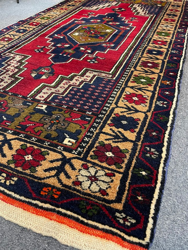 A finely woven vintage Yahyali rug from Turkey, all handwoven with 100% organic vegetable-dyed wool. This is a pile-knotted rug. Measurements do not include the fringe length. This piece would be great in any living space.